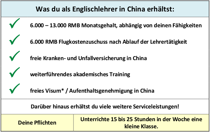 Die unten aufgeführten Leistungen beziehen sich auf die meisten Lehrerstellen in China. Abhängig von der Schule, an der du unterrichtest, kann es sein, dass dir zusätzliche Leistungen oder höhere Gehälter geboten werden.
