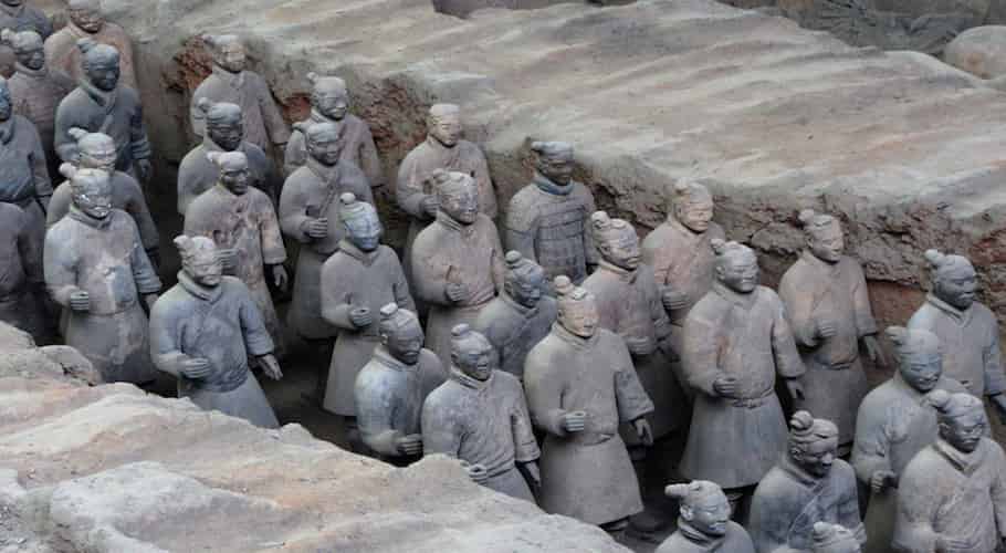 These technological innovations enabled the kingdom of Qin, which gave China its present name, to conquer the other kingdoms of China within 9 years, and in 221 BC China has been unified. To express its uniqueness, Qin Ying Zheng adopted the title of Emperor (Huangdi). He has been the first emperor of China and is, until today, a quite controversial figure. On the one hand, he unified the country. He initiated the construction of the first Great Wall, and his grave side, which has been protected by the terracotta army, is world famous. He divided China into 36 prefectures and abolished hereditary administrative and military offices; every free man could reach a position according to his abilities and achievements. He also standardized writing, currency, weights and measurements. On the other hand, he introduced a draconian legal system that regulated the smallest details of daily life known as legalism. All deviating philosophies were banned and their writings were burned. He ordered to burry 460 Confucian scholars alive. Towards the end of his reign, around 10% of China's population has been enslaved to work for his massive construction projects.