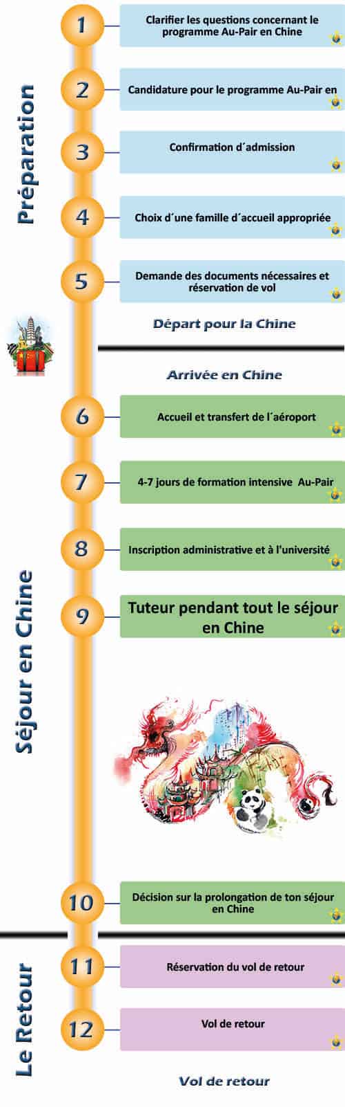 Ces prestations sont nécessaires afin d´être en mesure de pouvoir rester en Chine. Nous t´aidons à faire face aux formalités nécessaires et à choisir une famille d´accueil appropriée. Tu trouveras plus d´informations dans le menu "Candidature".